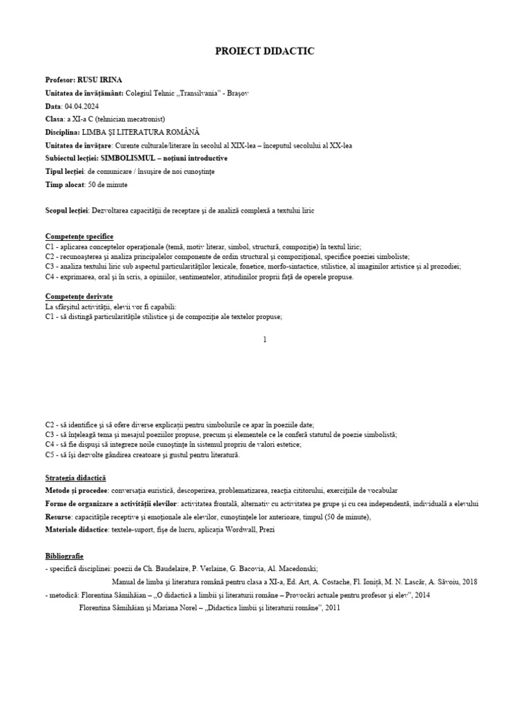 simbolismului (Anexa 2). Profesorul apreciază cadrului