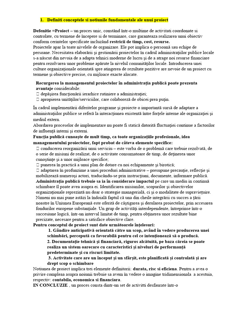 Notiunea de proiect implica trei elemente definitorii: durata, risc si eficiena. Pentru a avea o