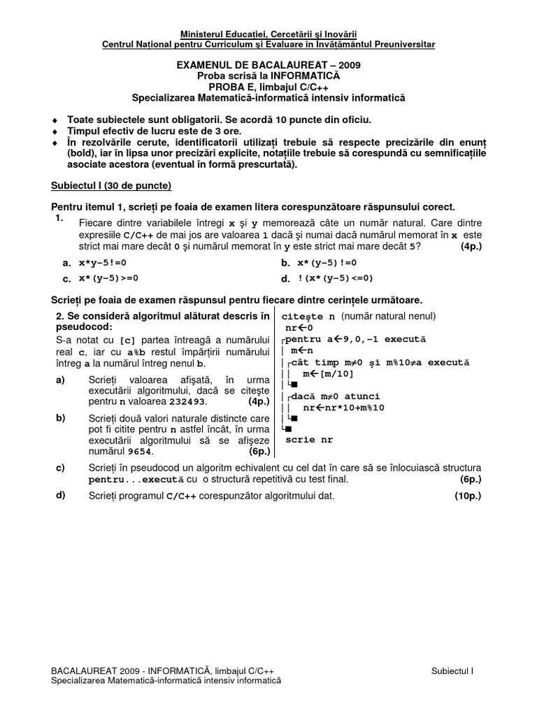 BACALAUREAT 2009 - INFORMATICĂ, limbajul C/C++ Subiectul I