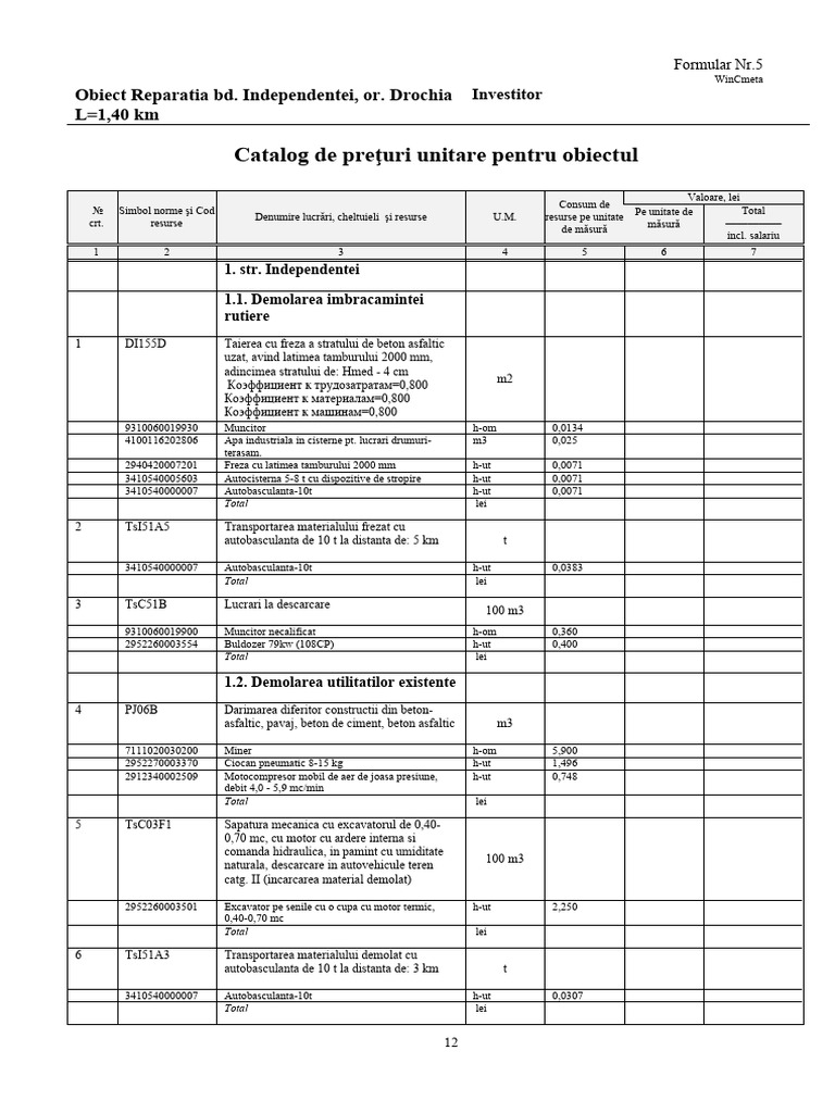 Catalog de preţuri unitare pentru obiectul
