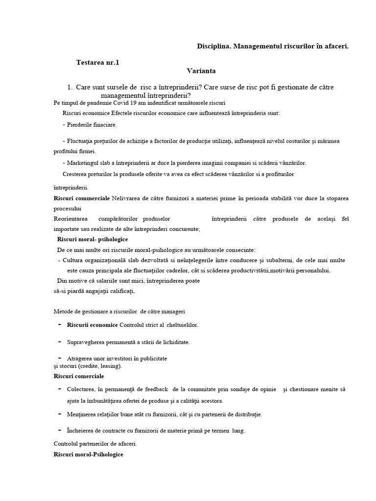 1. Care sunt sursele de risc a întreprinderii? Care surse de risc pot fi gestionate de către