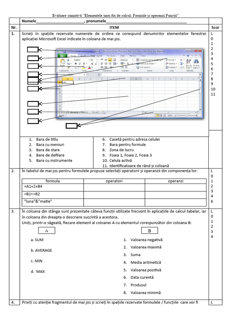 Evaluare sumativă ”Elementele unei foi de calcul. Formule și [Link]ții”