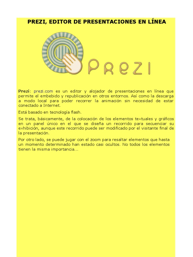 Prezi: prezi.com es un editor y alojador de presentaciones en lnea que permite el embebido y republicacin en otros entornos. As como la descarga a modo local para poder recorrer la animacin sin necesidad de estar conectado a Internet. Est basado en tecnologa flash. Se trata, bsicamente, de la colocacin de los elementos textuales y grficos en un panel nico en el que se disea un recorrido para secuenciar su exhibicin, aunque este recorrido puede ser modificado por el visitante final de la presentacin. Por otro lado, se puede jugar con el zoom para resaltar elementos que hasta un momento determinado han estado casi ocultos. No todos los elementos tienen la misma importancia...