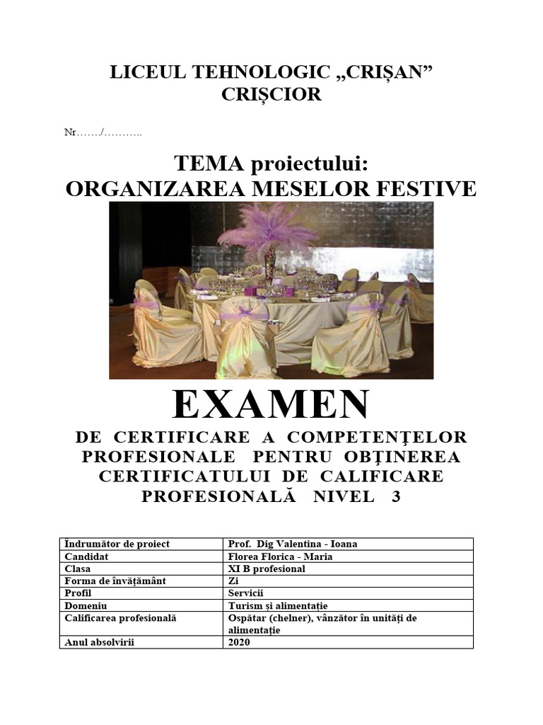 - stabilirea formei de amenajare a sălii cu mese,scaune,decoraţiuni,etc;