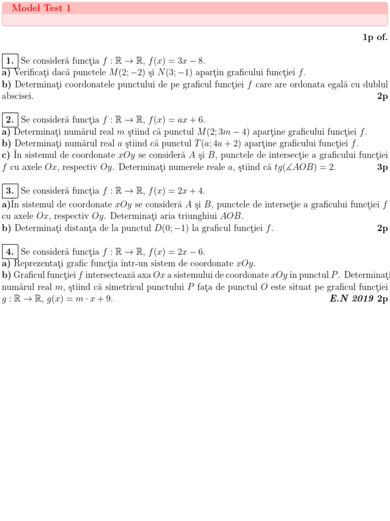 a) Verificaţi dacă punctele M (4; −2) şi N (−2; −10) aparţin graficului funcţiei f . 1p