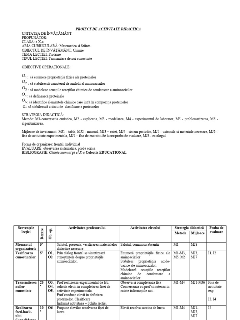 Mijloace de invatamant: MJ1 - tabla, MJ2 - manual, MJ3 – caiet, MJ4 - sistem periodic, MJ5 - ustensile si materiale necesare, MJ6 -