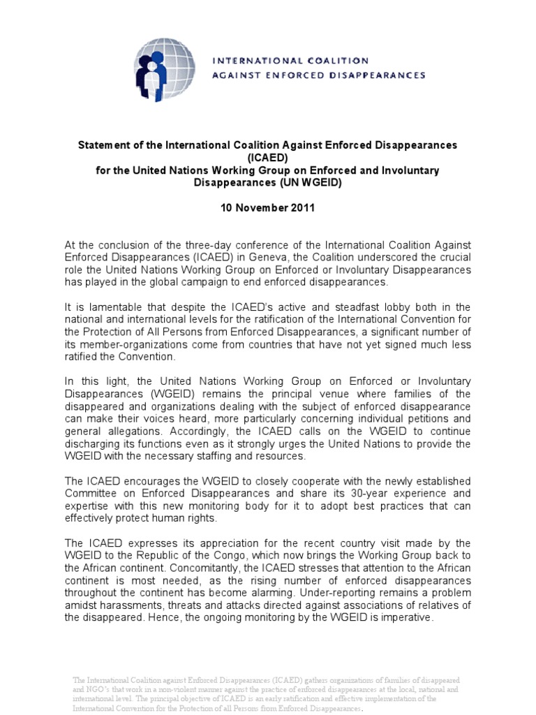 At the conclusion of the three-day conference of the International Coalition Against Enforced Disappearances (ICAED) in Geneva, the Coalition underscored the crucial role the United Nations Working Group on Enforced or Involuntary Disappearances has played in the global campaign to end enforced disappearances. It is lamentable that despite the ICAEDs active and steadfast lobby both in the national and international levels for the ratification of the International Convention for the Protection of All Persons from Enforced Disappearances, a significant number of its member-organizations come from countries that have not yet signed much less ratified the Convention. In this light, the United Nations Working Group on Enforced or Involuntary Disappearances (WGEID) remains the principal venue where families of the disappeared and organizations dealing with the subject of enforced disappearance can make their voices heard, more particularly concerning individual petitions and general allegations. Accordingly, the ICAED calls on the WGEID to continue discharging its functions even as it strongly urges the United Nations to provide the WGEID with the necessary staffing and resources. The ICAED encourages the WGEID to closely cooperate with the newly established Committee on Enforced Disappearances and share its 30-year experience and expertise with this new monitoring body for it to adopt best practices that can effectively protect human rights. The ICAED expresses its appreciation for the recent country visit made by the WGEID to the Republic of the Congo, which now brings the Working Group back to the African continent. Concomitantly, the ICAED stresses that attention to the African continent is most needed, as the rising number of enforced disappearances throughout the continent has become alarming. Under-reporting remains a problem amidst harassments, threats and attacks directed against associations of relatives of the disappeared. Hence, the ongoing monitoring by the WGEID is imperative.