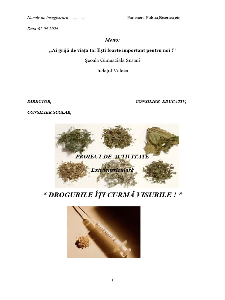 Denumirea activităţii : "DROGURILE ÎŢI CURMĂ VISURILE!".