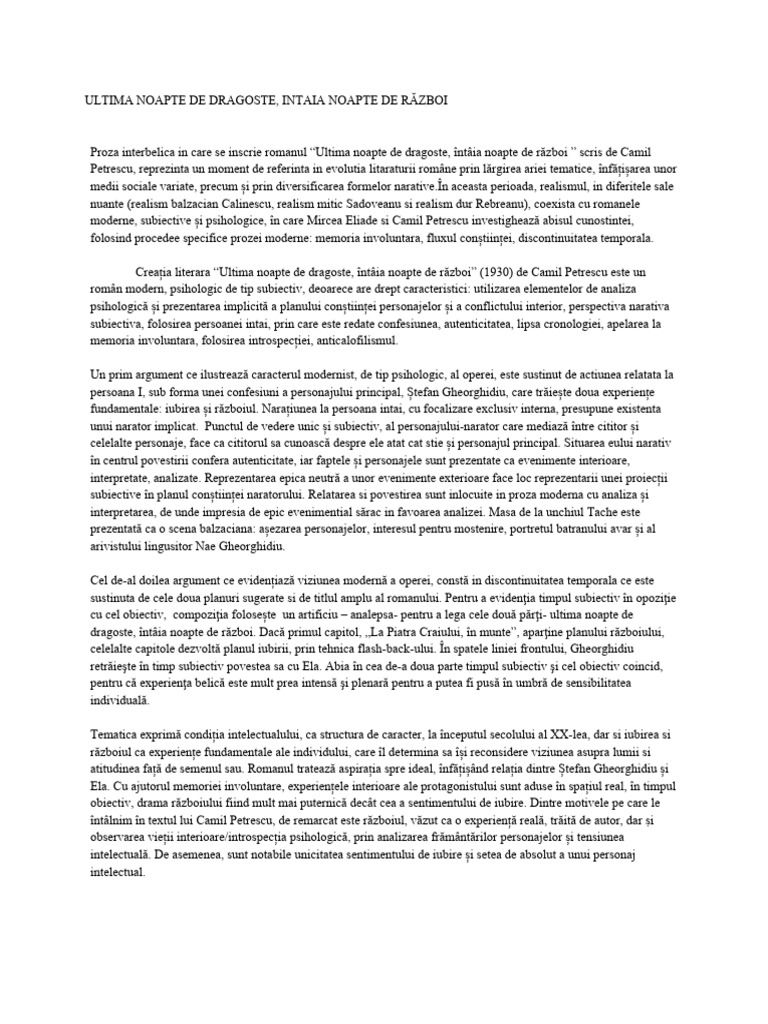 Creația literara “Ultima noapte de dragoste, intaia noapte de rzboi” scrisă de Camil Petrescu este un roman