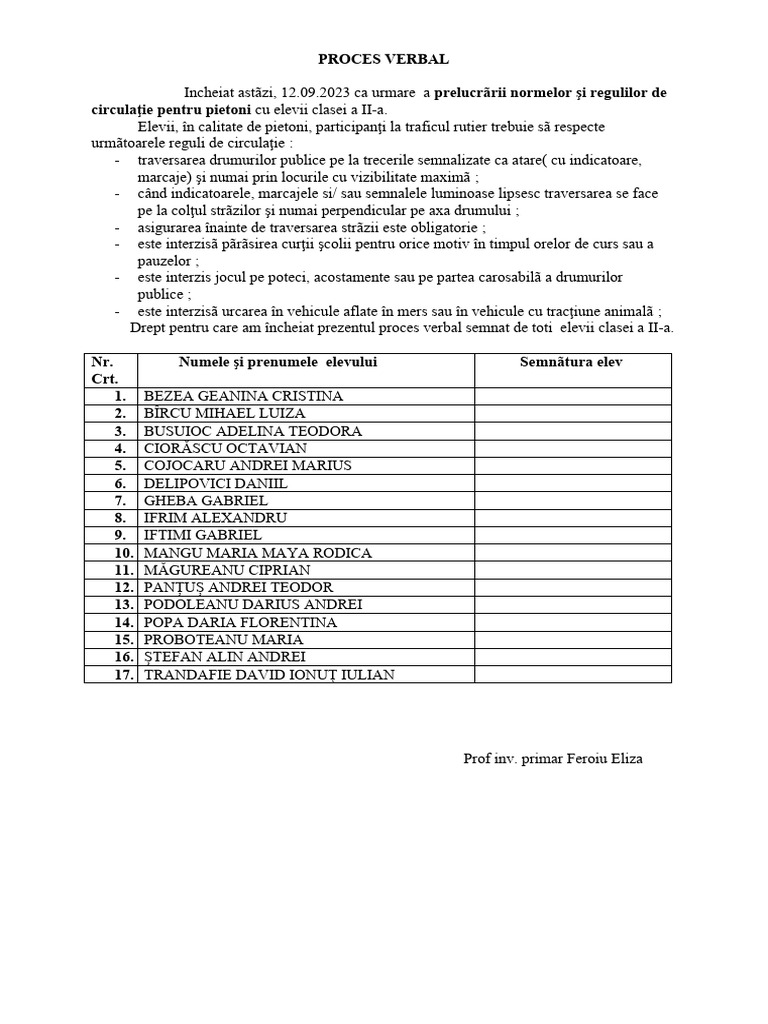 Drept pentru care am încheiat prezentul proces verbal semnat de toţi elevii clasei