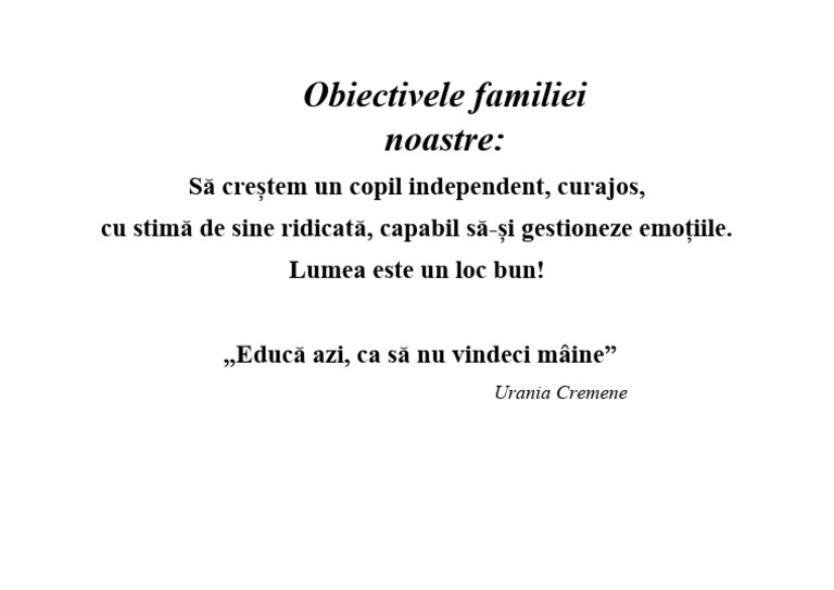 noastre: Să creștem un copil independent, curajos,cu stimă de sine ridicată, capabil să-și gestioneze emoțiile. Lumea este un loc bun!