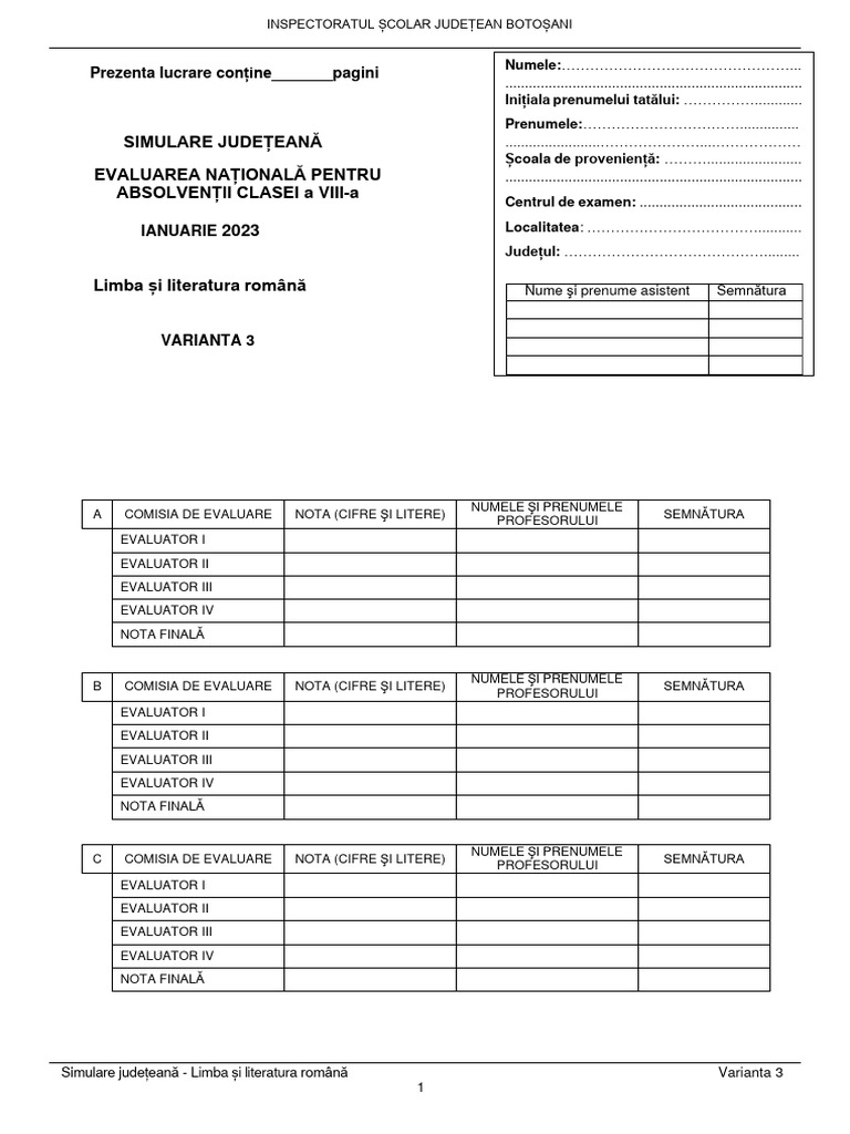 B COMISIA DE EVALUARE NOTA (CIFRE ŞI LITERE) SEMNĂTURA