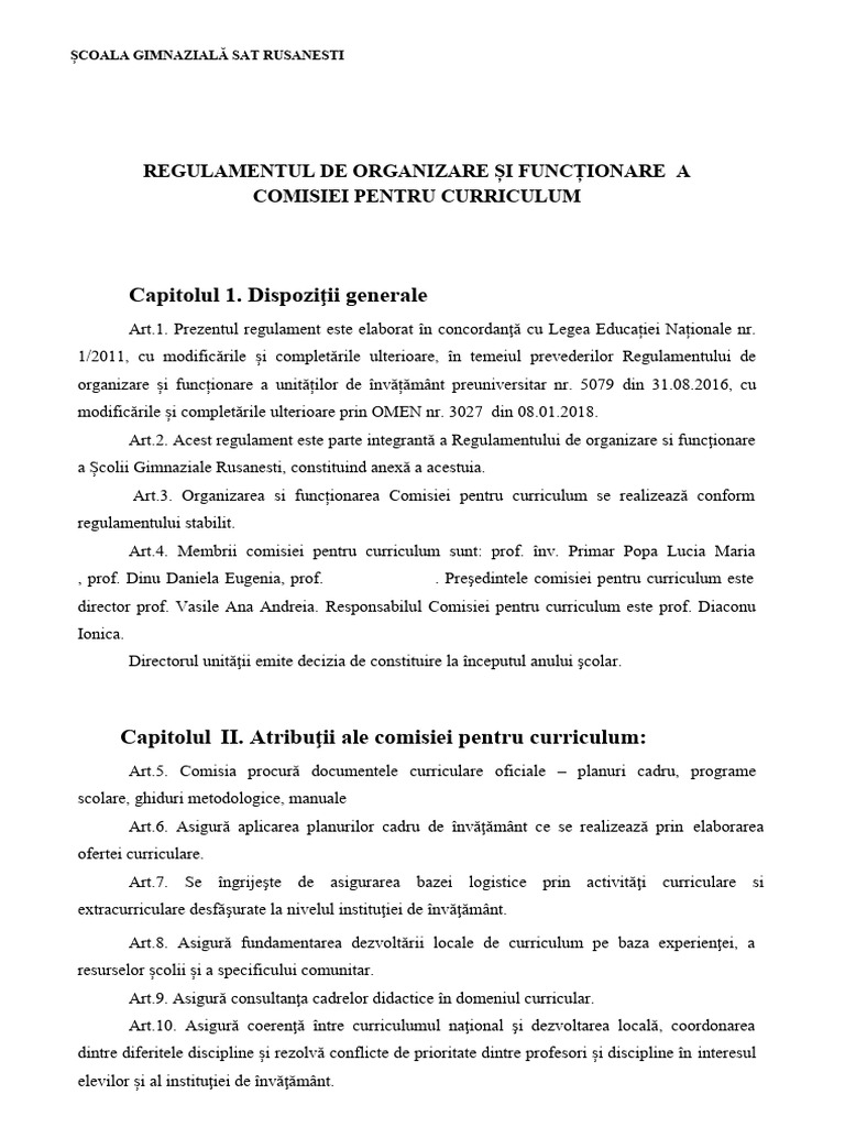 Art.4. Membrii comisiei pentru curriculum sunt: prof. înv. Primar Popa Lucia Maria