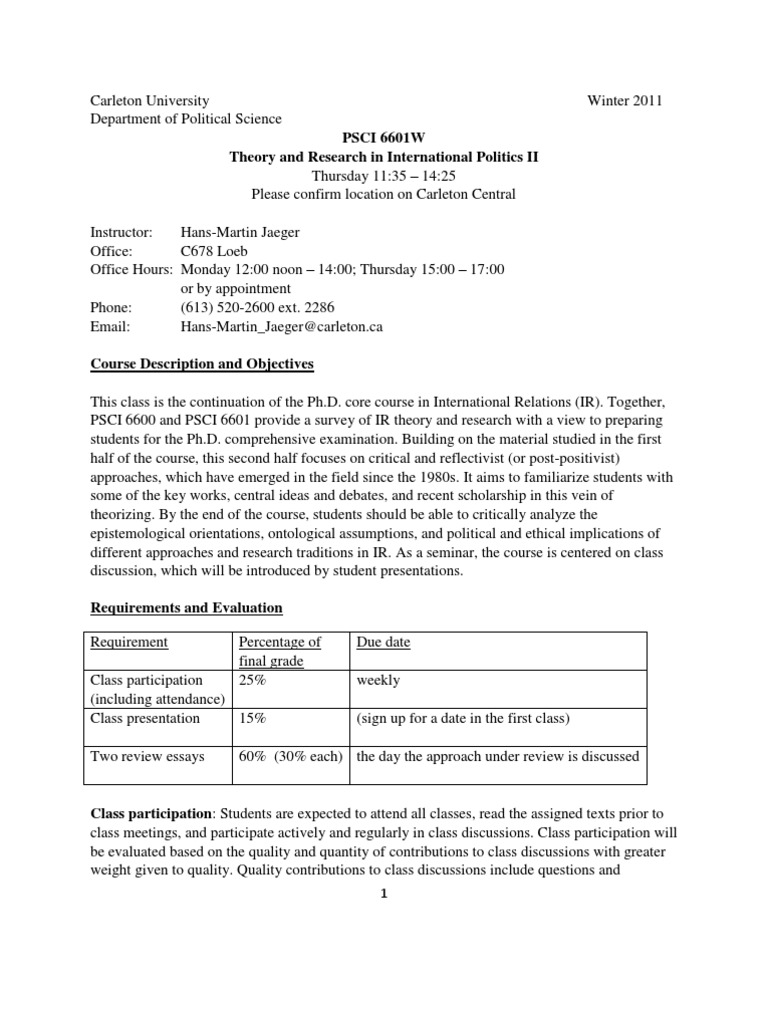 This class is the continuation of the Ph.D. core course in International Relations (IR). Together, PSCI 6600 and PSCI 6601 provide a survey of IR theory and research with a view to preparing students for the Ph.D. comprehensive examination. Building on the material studied in the first half of the course, this second half focuses on critical and reflectivist (or post-positivist) approaches, which have emerged in the field since the 1980s. It aims to familiarize students with some of the key works, central ideas and debates, and recent scholarship in this vein of theorizing. By the end of the course, students should be able to critically analyze the epistemological orientations, ontological assumptions, and political and ethical implications of different approaches and research traditions in IR. As a seminar, the course is centered on class discussion, which will be introduced by student presentations. Requirements and Evaluation Requirement Percentage of final grade 25% Due date weekly (sign up for a date in the first class)