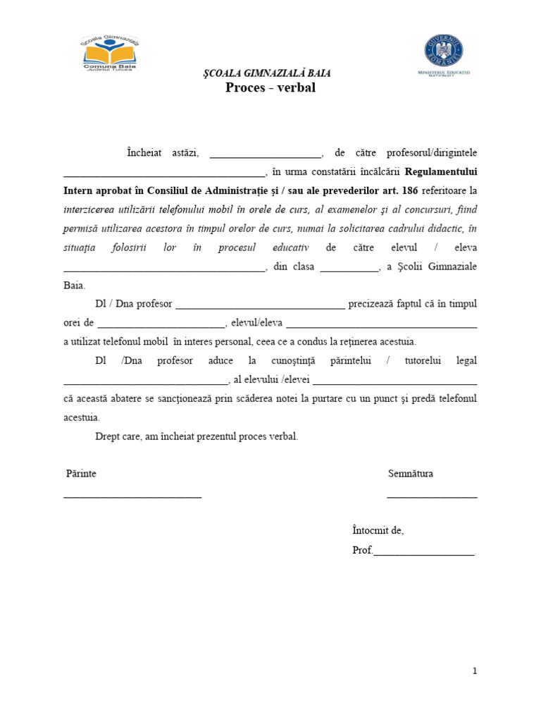 Încheiat astăzi, _____________________, de către profesorul/dirigintele