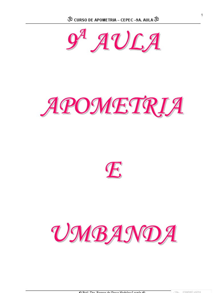 com o amor e a verdade", como costumava dizer, Dr. LACERDA foi incompreendido pelas elites diretoras do movimento esprita brasileiro e, como conseqncia, a APOMETRIA at os dias de hoje, no aceita por muitas casas espritas que cumprem a orientao da Federao Esprita Brasileira e de suas congneres estaduais. Lamentvel que a maioria dos que criticam e se opem APOMETRIA, j amais leram seus textos bsicos ou sequer assistiram um trabalho apomtrico bem orientado. Julgam, por ouvir dizer, e anematizam uma tcnica que, em muito, pode auxiliar os propsitos do Espiritismo. A APOMETRIA apenas uma tcnica de trabalho. No prope qualquer alterao nem acrescenta nada aos fundamentos filosficos e ticos da Doutrina Esprita. Felizmente o nmero dos que estudam e compreendem a APOMETRIA multiplica-se a cada dia. Hoje, o nmero de trabalhadores espritas e espiritualistas em geral, que aplicam a APOMETRIA com amor e por amor , contam-se s centenas. Acreditamos que, muito em breve, incompreenses e resistncia, comuns toda idia nova e revolucionria, face a clareza de propsitos e fidelidade ao amor e a verdade em que se fundamenta a APOMETRIA, caro. A APOMETRIA ser ento mais um dos muitos instrumentos de trabalho espiritual, pelos quais a Misericrdia Divina nos socorre e ampara. Na CASA DO JARDIM , Instituio Esprita Assistencial, criada pelo Dr. LACERDA em maro de 1987, colaboram homens e mulheres de boa vontade, oriundos a maioria do espiritismo, muitos da Umbanda, outros da Teosofia, Esoterismo ou Maonaria. Isso no tem sido impedimento para que a APOM ETRIA, usada com amor, sirva em nome do Cristo. As falhas e dificuldades devem-se as nossa imperfeies humanas. Segundo Ramats, a Apometria, pela acertada diagnose realizada e diante da complexa etiologia espiritual envolvida, torna-se cada vez mais valorizada pela Espiritualidade. abenoado blsamo previsto pelo Altssimo e que dever crescer nesses novos tempos, mais arej ado e universalistas. Vem consolar os aflitos e sofredores, trazendo-lhes a cura e o alvio das aflies mais imediatas. como se retirassem de uma cmara escura, inspida e sem ar, um ser quase moribundo e lhe dessem a oportunidade de respirar o ar lmpido e de se preparar mais convenientemente no campo da reforma ntima. As falanges espirituais da Umbanda do enorme sustento nesses trabalhos de Apometria. Os ndios e pretos velhos trabalham na retaguarda, propiciando guarnio segura diante dessas entidades empedernidas de maldade. Se houver um ou dois mdiuns umbandistas no grupo apomtrico, ganharo os encarnados considervel reforo, j que as entidades que se faro presentes, incorporadas e de maneira mais ostensiva, preservaro integralmente o corpo medinico desses fluidos mais deletrios. No h necessidade de nenhum ritual diferente, basta dar espao para esses irmos amorosos se movimentarem e praticarem a caridade, e vereis que no s o inferiores nem indisciplinados como apregoam alguns confrades espritas desavisados do amor crstico que move todos do lado de c. bom relembrarmos que desde os primrdios da Apometria, no Hospital Esprita de Porto Alegre, o Dr. Lacerda sempre trabalhou com as entidades de Umbanda. Se fizssemos um filme da vida deste
