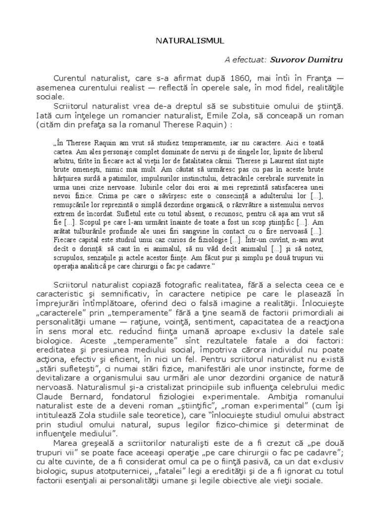 a curentului realist reflect n operele sale, n mod fidel, realitile sociale. Scriitorul naturalist vrea de-a dreptul s se substituie omului de tiin. Iat cum nelege un romancier naturalist, Emile Zola, s conceap un roman (citm din prefaa sa la romanul Therese Raquin) : n Therese Raquin am vrut s studiez temperamente, iar nu caractere. Aici e toat cartea. Am ales personaje complet dominate de nervii i de sngele lor, lipsite de liberul arbitru, trte n fiecare act al vieii lor de fatalitatea crnii. Therese i Laurent snt nite brute omeneti, nimic mai mult. Am cutat s urmresc pas cu pas n aceste brute hruirea surd a patimilor, impulsurilor instinctului, detracrile cerebrale survenite n urma unei crize nervoase. Iubirile celor doi eroi ai mei reprezint satisfacerea unei nevoi fizice. Crima pe care o svresc este o consecin a adulterului lor [...], remucrile lor reprezint o simpl dezordine organic, o rzvrtire a sistemului nervos extrem de ncordat. Sufletul este cu totul absent, o recunosc, pentru c aa am vrut s fie [...]. Scopul pe care l-am urmrit nainte de toate a fost un scop tiinific [...]. Am artat tulburrile profunde ale unei firi sangvine n contact cu o fire nervoas [...]. Fiecare capital este studiul unui caz curios de fiziologie [...]. ntr-un cuvnt, n-am avut dect o dorin: s caut n ei animalul, s nu vd dect animalul [...] i s notez, scrupulos, senzaiile i actele acestor fiine. Am fcut pur i simplu pe dou trupuri vii operaia analitic pe care chirurgii o fac pe cadavre. Scriitorul naturalist copiaz fotografic realitatea, fr a selecta ceea ce e caracteristic i semnificativ, n caractere netipice pe care le plaseaz n mprejurri ntmpltoare, oferind deci o fals imagine a realitii. nlocuiete caracterele prin temperamente fr a ine seam de factorii primordiali ai personalitii umane raiune, voin, sentiment, capacitatea de a reaciona n sens moral etc. reducnd fiina uman aproape exclusiv la datele sale biologice. Aceste temperamente snt rezultatele fatale a doi factori: ereditatea i presiunea mediului social, mpotriva crora individul nu poate aciona, efectiv i eficient, n nici un fel. Pentru scriitorul naturalist nu exist stri sufleteti, ci numai stri fizice, manifestri ale unor instincte, forme de devitalizare a organismului sau urmri ale unor dezordini organice de natur nervoas. Naturalismul i-a cristalizat principiile sub influena celebrului medic Claude Bernard, fondatorul fiziologiei experimentale. Ambiia romanului naturalist este de a deveni roman tiinific, roman experimental (cum i intituleaz Zola studiile sale teoretice), care nlocuiete studiul omului abstract prin studiul omului natural, supus legilor fizico-chimice i determinat de influenele mediului. Marea greeal a scriitorilor naturaliti este de a fi crezut c pe dou trupuri vii se poate face aceeai operaie pe care chirurgii o fac pe cadavre; cu alte cuvinte, de a fi considerat omul ca pe o fiin pasiv, ca un dat exclusiv biologic, supus atotputernicei, fatalei legi a ereditii i de a fi ignorat cu totul factorii eseniali ai personalitii umane i legile obiective ale vieii sociale.