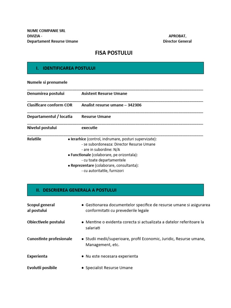Denumirea postului Asistent Resurse Umane