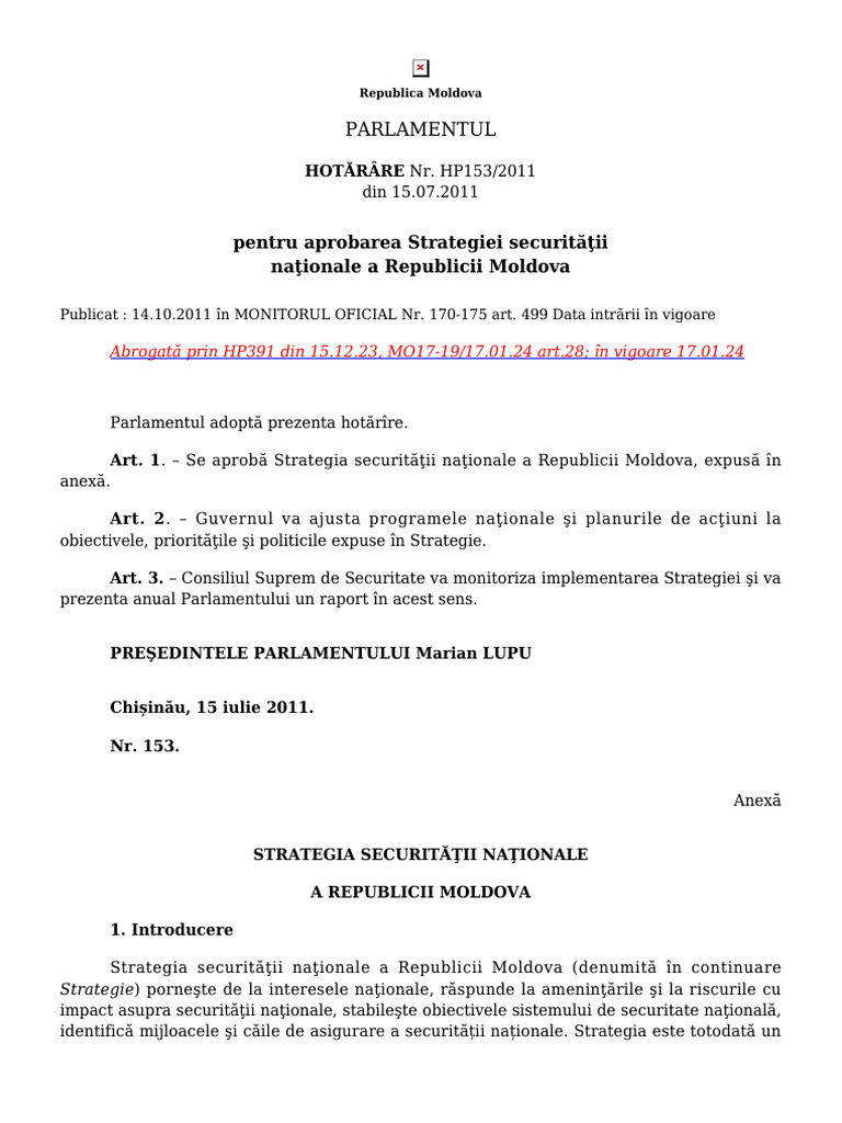 Art. 1. – Se aprobă Strategia securităţii naţionale a Republicii Moldova, expusă în