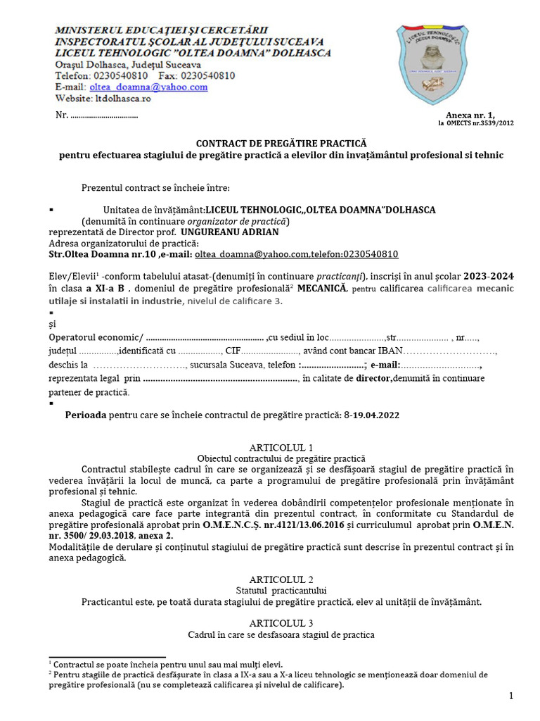 Elev/Elevii1 -conform tabelului atasat-(denumiţi în continuare practicanţi), inscrişi în anul şcolar 2023-2024