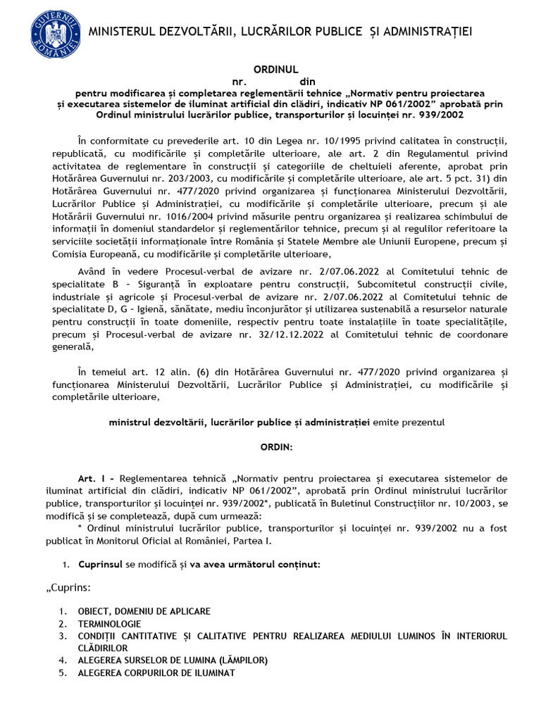 iluminat artificial din clădiri, indicativ NP 061/2002”, aprobată prin Ordinul ministrului lucrărilor