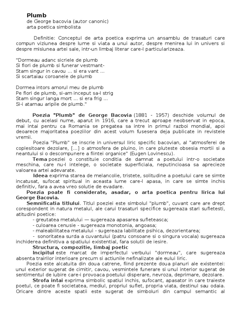 de George bacovia (autor canonic) arta poetica simbolista Definitie: Conceptul de arta poetica exprima un ansamblu de trasaturi care compun viziunea despre lume si viata a unui autor, despre menirea lui in univers si despre misiunea artei sale, intr-un limbaj literar care-l particularizeaza. "Dormeau adanc sicriele de plumb Si flori de plumb si funerar vestmantStam singur in cavou ... si era vant ... Si scartaiau coroanele de plumb Dormea intors amorul meu de plumb Pe flori de plumb, si-am inceput sa-l strig Stam singur langa mort ... si era frig ... Si-i atarnau aripile de plumb." Poezia "Plumb" de George Bacovia (1881 - 1957) deschide volumul de debut, cu acelasi nume, aparut in 1916, care a trecut aproape neobservat in epoca, mai intai pentru ca Romania se pregatea sa intre in primul razboi mondial, apoi deoarece majoritatea poeziilor din acest volum fusesera deja publicate in revistele vremii. Poezia "Plumb" se inscrie in universul liric specific bacovian, al "atmosferei de coplesitoare dezolare, [...] o atmosfera de pluino, in care pluteste obsesia mortii si a neantului si o descompunere a fiintei organice" (Eugen Lovinescu). Tema poeziei o constituie conditia de damnat a poetului intr-o societate meschina, care nu-l intelege, o societate superficiala, neputincioasa sa aprecieze valoarea artei adevarate. Ideea exprima starea de melancolie, tristete, solitudine a poetului care se simte incatusat, sufocat spiritual in aceasta lume care-l apasa, in care se simte inchis definitiv, fara a avea vreo solutie de evadare. Poezia poate fi considerate, asadar, o arta poetica pentru lirica lui George Bacovia. Semnificatia titlului. Titlul poeziei este simbolul "plumb", cuvant care are drept corespondent in natura metalul, ale carui trasaturi specifice sugereaza stari sufletesti, atitudini poetice: - greutatea metalului sugereaza apasarea sufleteasca; - culoarea cenusie - sugereaza monotonia, angoasa; - maleabilitatea metalului - sugereaza labilitate psihica, dezorientarea; - sonoritatea surda a cuvantului (patru consoane si o singura vocala) sugereaza inchiderea definitiva a spatiului existential, fara solutii de iesire. Structura, compozitie, limbaj poetic Incipitul este marcat de imperfectul verbului "dormeau", care sugereaza absenta trairilor interioare precum si actiunile nefinalizate ale eului liric. Poezia este alcatuita din doua catrene, fiind prezente doua planuri ale existentei: unul exterior sugerat de cimitir, cavou, vesmintele funerare si unul interior sugerat de sentimentul de iubire care-i provoaca poetului disperare, nevroza, deprimare, dezolare. Strofa intai exprima simbolic spatiul inchis, sufocant, apasator in care traieste poetul, ce poate fi societatea, mediul, propriul suflet, propria viata, destinul sau odaia. Oricare dintre aceste spatii este sugerat de simboluri din campul semantic al