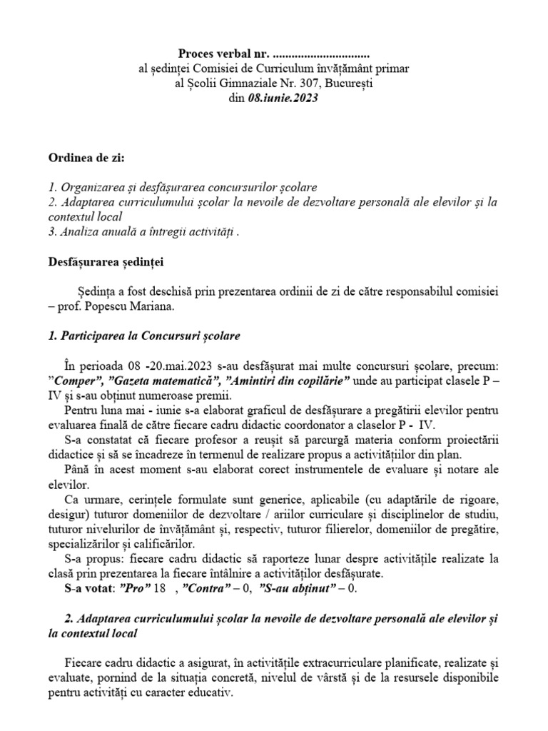 Școala Gimnazială Nr. 307 creat un cadru organizat pentru desfășurarea unui proces