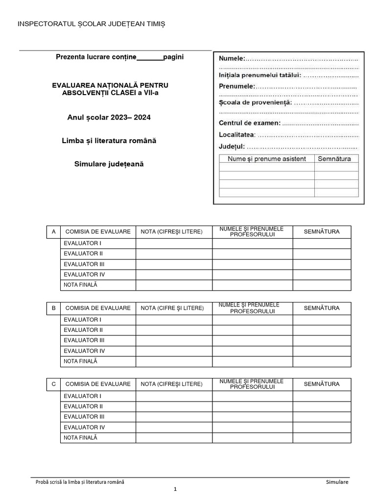 B COMISIA DE EVALUARE NOTA (CIFRE ŞI LITERE) SEMNĂTURA