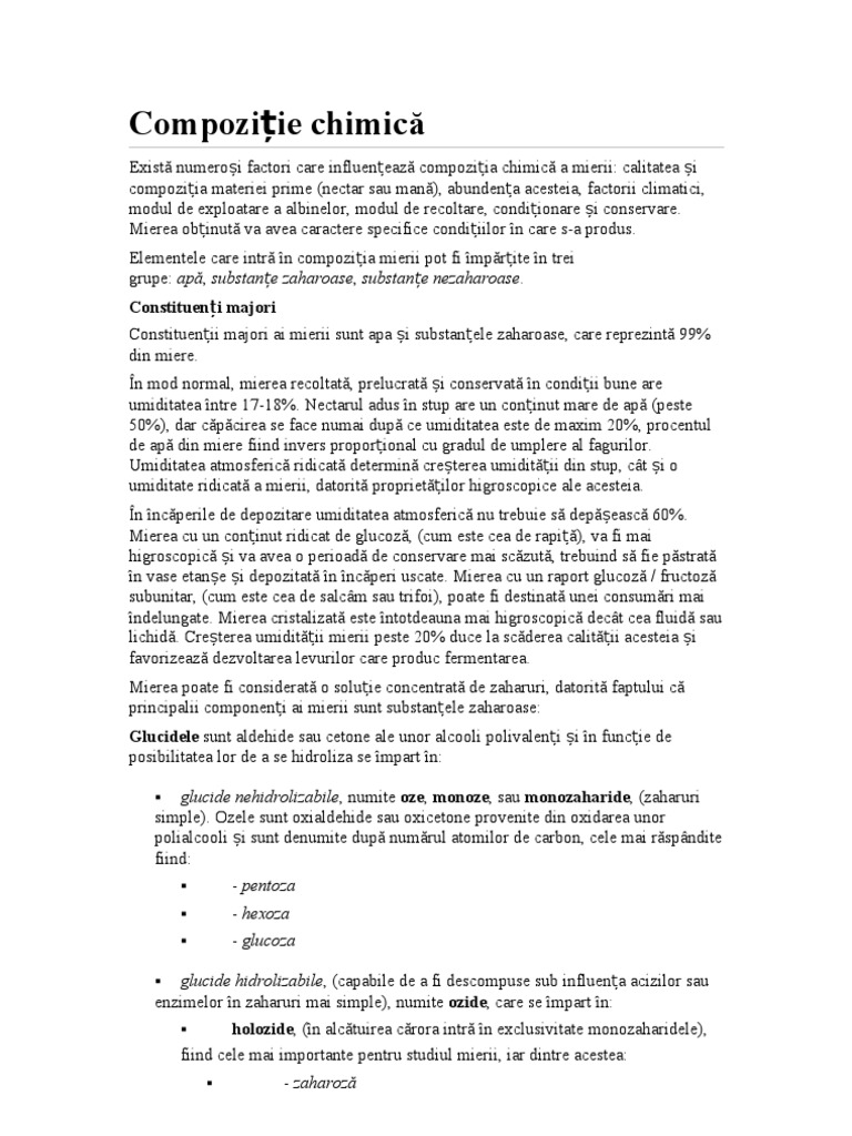 neglucidic (sau aglicon). Dextrinele. n miere se mai gsesc n cantiti mari i alte holozide complexe sau heterozide ca mucegaiuri, gume, etc, denumite impropriudextrine. n mierea de man dextrinele pot depi 5%. Prezena dextrinelor mrete vscozitatea mierii i i d un aspect cleios, neplcut. Cantitatea medie (%) a constituenilor majori ai mierii, conform rezultatelor studiilor[2] efectuate n patru ri, printre care s-a aflat i Romnia. Coloana "interval" cuprinde valori individuale de la cele mai mici la cele mai mari, pentru 1063 de tipuri de miere studiate. Constitueni majori USSR Statele (aproximativ Media Romnia (1955) Australia (1974) interval (1963) Unite(1962) 99% din miere) ap fructoz glucoz sucroz Numrul probelor 16,5 38,4 34,0 3,1 1036 17,0 39,3 32,9 2,3 257 18,6 37,4 35,9 2,1 217 17,2 38,2 31,3 1,3 490 15,6 43,3 30,2 2,5 99 13.4 26.6 21.7 53.9 20.4 44.4 0.0 - 7.6 -