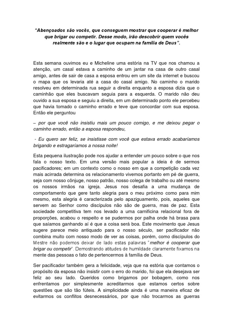 Esta semana ouvimos eu e Micheline uma estria na TV que nos chamou a ateno, um casal estava a caminho de um jantar na casa de outro casal amigo, antes de sair de casa a esposa entrou em um site da internet e buscou o mapa que os levaria at a casa do casal amigo. No caminho o marido resolveu em determinada rua seguir a direita enquanto a esposa dizia que o caminho que eles buscavam seguia para a esquerda. O marido no deu ouvido a sua esposa e seguiu a direita, em um determinado ponto ele percebeu que havia tomado o caminho errado e teve que concordar com sua esposa. Ento ele perguntou por que voc no insistiu mais um pouco comigo, e me deixou pegar o caminho errado, ento a esposa respondeu, - Eu quero ser feliz, se insistisse com voc que estava errado acabaramos brigando e estragaramos a nossa noite! Esta pequena ilustrao pode nos ajudar a entender um pouco sobre o que nos fala o nosso texto. Em uma verso mais popular a ideia de sermos pacificadores; em um contexto como o nosso em que a competio cada vez mais acirrada determina os relacionamento vivemos portanto em p de guerra, seja com nosso cnjuge, nosso patro, nosso colega de trabalho ou at mesmo os nossos irmos na igreja. Jesus nos desafia a uma mudana de comportamento que gere tanto alegria para o meu prximo como para mim mesmo, esta alegria caracterizada pelo apaziguamento, pois, aqueles que servem ao Senhor como discpulos no so de guerra, mas de paz. Esta sociedade competitiva tem nos levado a uma carnificina relacional fora de propores, acabou o respeito e se pudermos por palha onde h brasa para que saamos ganhando a que a coisa ser boa. Este movimento que Jesus sugere parece meio antiquado para o nosso sculo, ser pacificador no combina muito com nosso modo de ver as coisas, porm, como discpulos do Mestre no podemos deixar de lado estas palavras melhor cooperar que brigar ou competir. Demostrando atitudes de humildade claramente fixamos na mente das pessoas o fato de pertencermos famlia de Deus. Ser pacificador tambm gera a felicidade, veja que na estria que contamos o propsito da esposa no insistir com o erro do marido, foi que ela desejava ser feliz ao seu lado. Queridos como brigamos por bobagem, como nos enfrentamos por simplesmente acreditarmos que estamos certos sobre questes que so to fteis. A simplicidade ainda uma maneira eficaz de evitarmos os conflitos desnecessrios, por que no trocarmos as guerras