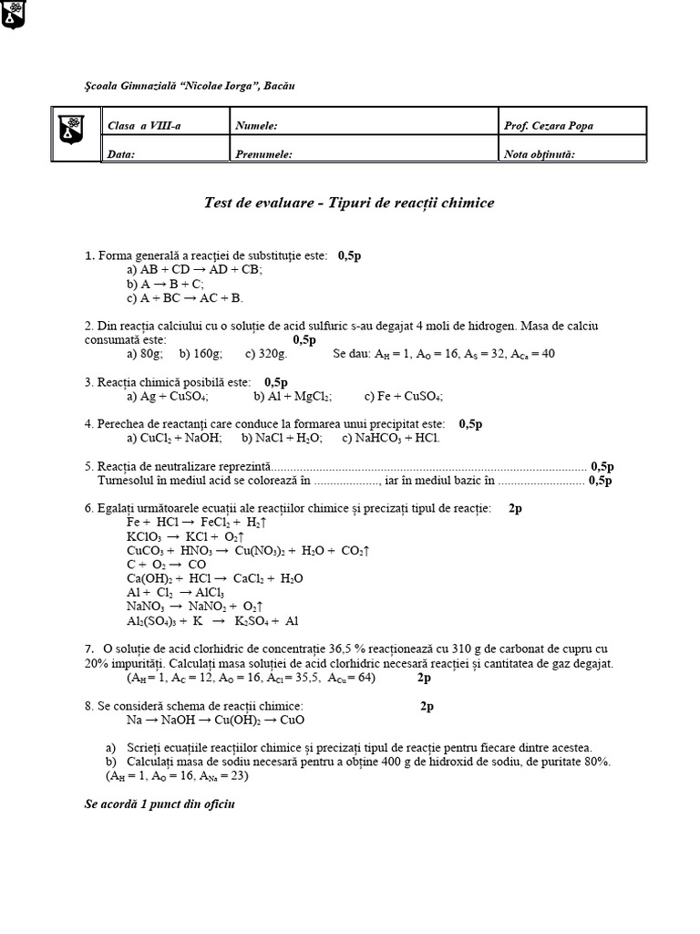 Test de evaluare - Tipuri de reacții chimice