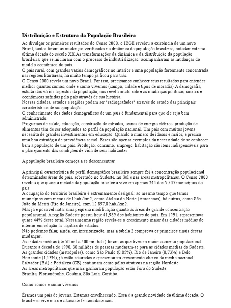 Ao divulgar os primeiros resultados do Censo 2000, o IBGE revelou a existncia de um novo Brasil, tantas foram as mudanas verificadas na dinmica da populao brasileira, notadamente na ltima dcada do sculo XX.As transformaes da dinmica e da distribuio da populao brasileira, que se iniciaram com o processo de industrializao, acompanharam as mudanas do modelo econmico do pas. O pas rural, com grandes vazios demogrficos no interior e uma populao fortemente concentrada nas regies litorneas, h muito tempo j ficou para trs. O Censo 2000 revela um novo Brasil. Por isso, precisamos conhecer seus resultados para entender melhor quantos somos, onde e como vivemos (campo, cidade e tipos de moradia).A demografia, estudo dos vrios aspectos da populao, nos revela muito sobre as mudanas polticas, sociais e econmicas sofridas pelo pas atravs de sua histria. Nossas cidades, estados e regies podem ser "radiografados" atravs do estudo das principais caractersticas de sua populao. O conhecimento dos dados demogrficos de um pas fundamental para que ele seja bem administrado. Programas de sade, educao, construo de estradas, usinas de energia eltrica. produo de alimentos tm de ser adequados ao perfil da populao nacional. Um pas com muitos jovens necessita de grandes investimentos em educao. Quando o nmero de idosos maior, preciso uma boa estratgia de previdncia social. Esses so apenas exemplos da necessidade de se conhecer bem a populao de um pas. Produo, consumo, emprego, habitao so itens indispensveis para o planejamento das condies de vida de seus habitantes. A populao brasileira comea a se desconcentrar. A principal caracterstica do perfil demogrfico brasileiro sempre foi a concentrao populacional determinadas reas do pas, sobretudo no Sudeste, no Sul e nas reas metropolitanas. O Censo 2000 revelou que quase a metade da populao brasileira vive em apenas 244 dos 5.507 municpios do pas. A ocupao do territrio brasileiro extremamente desigual: ao mesmo tempo que temos municpios com menos de l hab./km2, como Atalaia do Norte (Amazonas), h outros, como So Joo do Meriti (Rio de Janeiro), com 12 897,8 hab./km2. Mas j possvel notar uma pequena modifcao quanto s reas de grande concentrao populacional. A regio Sudeste possui hoje 41,989 dos habitantes do pas. Em 1991, representava quase 44% desse total. Nessa mesma regio revela-se o crescimento maior das cidades mdias do interior em relao s capitais de estados. No podemos falar, ainda, em interiorizao, mas a tabela 2 comprova os primeiros sinais dessas mudanas. As cidades mdias (de 50 mil a 500 mil hab.) foram as que tiveram maior aumento populacional. Durante a dcada de 1990, 30 milhes de pessoas mudaram-se para as cidades mdias do Sudeste. As grandes cidades (metrpoles), como So Paulo (0,85%). Rio de Janeiro (0,73%) e Belo Horizonte (1,13%), j esto saturadas e apresentaram crescimento abaixo da mdia nacional. Salvador (BA) e Fortaleza (CE) continuam como plos atrativos na regio Nordeste. As reas metropolitanas que mais ganharam populao esto Fora do Sudeste. Braslia, Florianpolis, Goinia, So Lus, Curitiba. Como somos e como vivemos ramos um pas de jovens. Estamos envelhecendo. Essa a grande novidade da ltima dcada. O brasileiro vive mais e a taxa de fecundidade caiu.