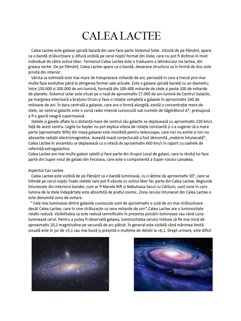 Calea Lactee este galaxie spirală barată din care face parte Sistemul Solar. Văzută de pe Pământ, apare