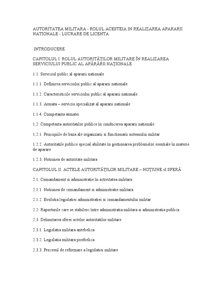 ROLUL AUTORITILOR MILITARE N REALIZAREA SERVICIULUI PUBLIC AL APRRII NAIONALE 1.1. Serviciul public al apararii nationale 1.1.1. Definirea serviciului public al apararii nationale 1.1.2. Caracteristicile serviciului public al apararii nationale 1.1.3. Armata serviciu specializat al apararii nationale 1.1.4. Competanta armatei 1.2. Competenta autoritatilor publice n conducerea apararii nationale 1.2.1. Principiile de baza ale organizarii si functionarii sistemului militar 1.2.2. Autoritatile publice special abilitate n gestionarea problemelor esentiale n materie de aparare 1.2.3. Notiunea de autoritate militara CAPITOLUL II. ACTELE AUTORITILOR MILITARE NOIUNE sI SFER 2.1. Comandament si administratie n activitatea militara 2.1.1. Notiunea de comandament si administratie militara 2.1.2. Evolutia legislatiei administratiei si comandamentului militar 2.2. Raporturile care se stabilesc ntre administratia militara si administratia publica 2.3. Delimitarea sferei actelor autoritatilor militare 2.3.1. Legislatia militara antebelica 2.3.2. Legislatia militara postbelica 2.3.3. Procesul de reformare a legislatiei militare
