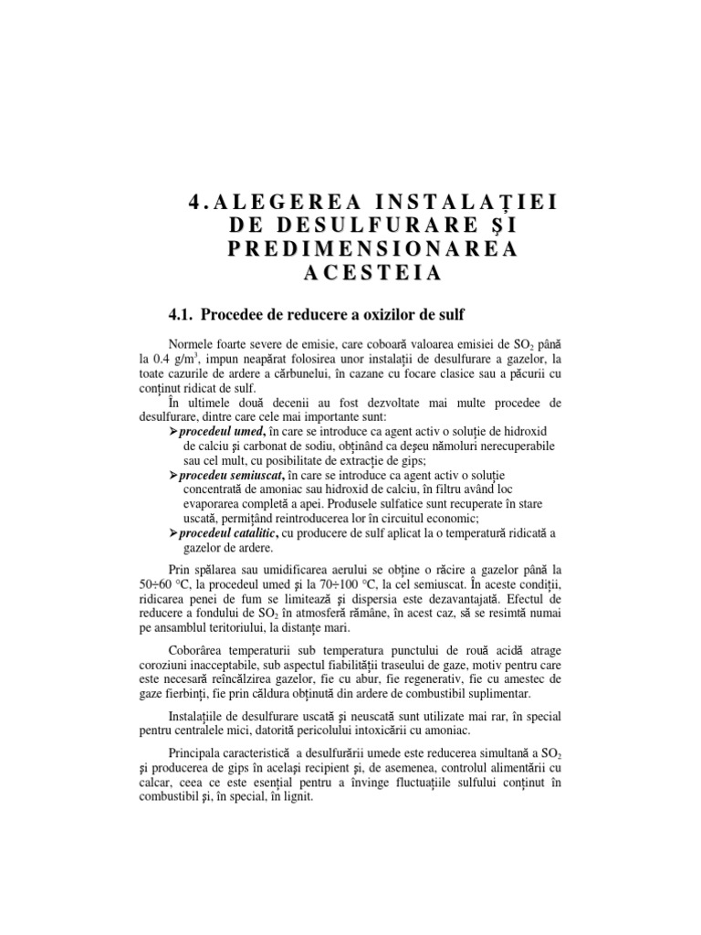 Rezult, aadar, urmtoarele concentra ii: mg = 254.600; 3 mN corectat mg pentru pcur cu con inut mediu de sulf: CSO 3 = 639.507; mN corectat mg pentru pcur cu con inut ridicat de sulf: CSO 3 = 1763.5. mN Dup cum se observ, pentru pcura de tip I, respectiv cu con inut redus de sulf, nu este necesar desulfurarea. Pentru pcura de tip II i III, cu con inut mediu i ridicat de sulf, este necesar desulfurarea.