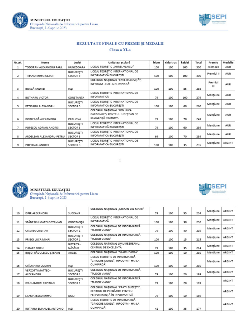 1 TODORAN ALEXANDRU RAUL HUNEDOARA LICEUL TEORETIC „AUREL VLAICU” 100 100 100 300 Premiul I AUR