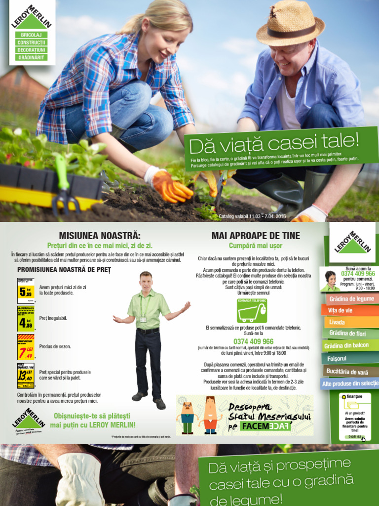 Prețurile menționate în acest catalog sunt valabile în perioada menționată pe catalog. Pentru verificarea prețului actualizat al produselor și a stocului disponibil, te rugăm să te adresezi magazinelor LEROY MERLIN. Detaliile tehnice ale produselor prezentate în acest catalog pot