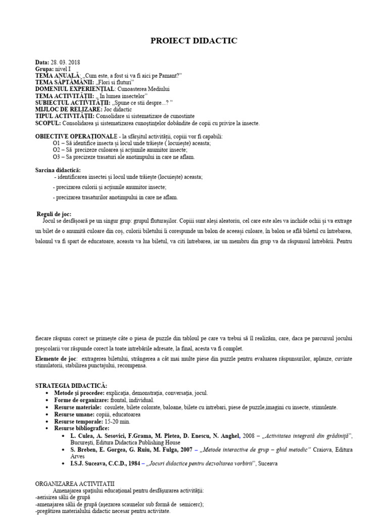 Resurse materiale: cosulete, bilete colorate, baloane, bilete cu intrebari, piese de puzzle,imagini cu insecte, stimulente.