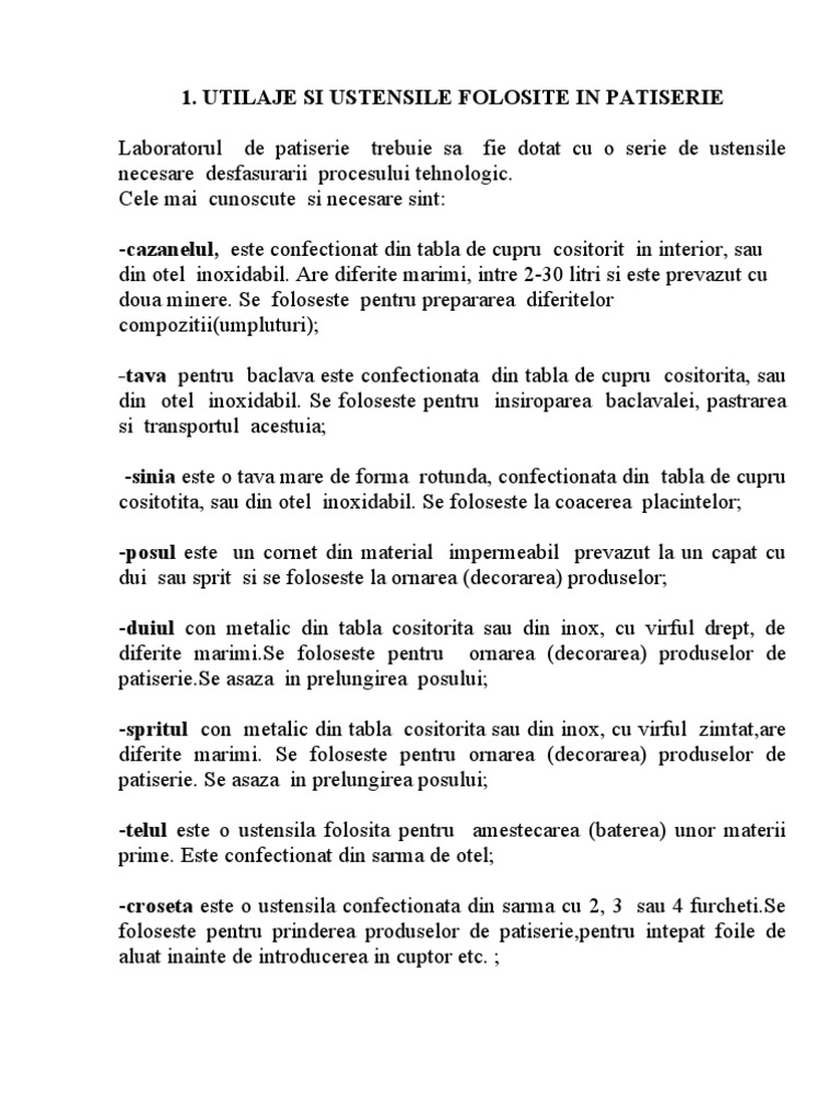 Cele mai cunoscute si necesare sint: -cazanelul, este confectionat din tabla de cupru cositorit in interior, sau din otel inoxidabil. Are diferite marimi, intre 2-30 litri si este prevazut cu doua minere. Se foloseste pentru prepararea diferitelor compozitii(umpluturi); -tava pentru baclava este confectionata din tabla de cupru cositorita, sau din otel inoxidabil. Se foloseste pentru insiroparea baclavalei, pastrarea si transportul acestuia; -sinia este o tava mare de forma rotunda, confectionata din tabla de cupru cositotita, sau din otel inoxidabil. Se foloseste la coacerea placintelor; -posul este un cornet din material impermeabil prevazut la un capat cu dui sau sprit si se foloseste la ornarea (decorarea) produselor; -duiul con metalic din tabla cositorita sau din inox, cu virful drept, de diferite [Link] foloseste pentru ornarea (decorarea) produselor de [Link] asaza in prelungirea posului; -spritul con metalic din tabla cositorita sau din inox, cu virful zimtat,are diferite marimi. Se foloseste pentru ornarea (decorarea) produselor de patiserie. Se asaza in prelungirea posului; -telul este o ustensila folosita pentru amestecarea (baterea) unor materii prime. Este confectionat din sarma de otel; -croseta este o ustensila confectionata din sarma cu 2, 3 sau 4 [Link] foloseste pentru prinderea produselor de patiserie,pentru intepat foile de aluat inainte de introducerea in cuptor etc. ;
