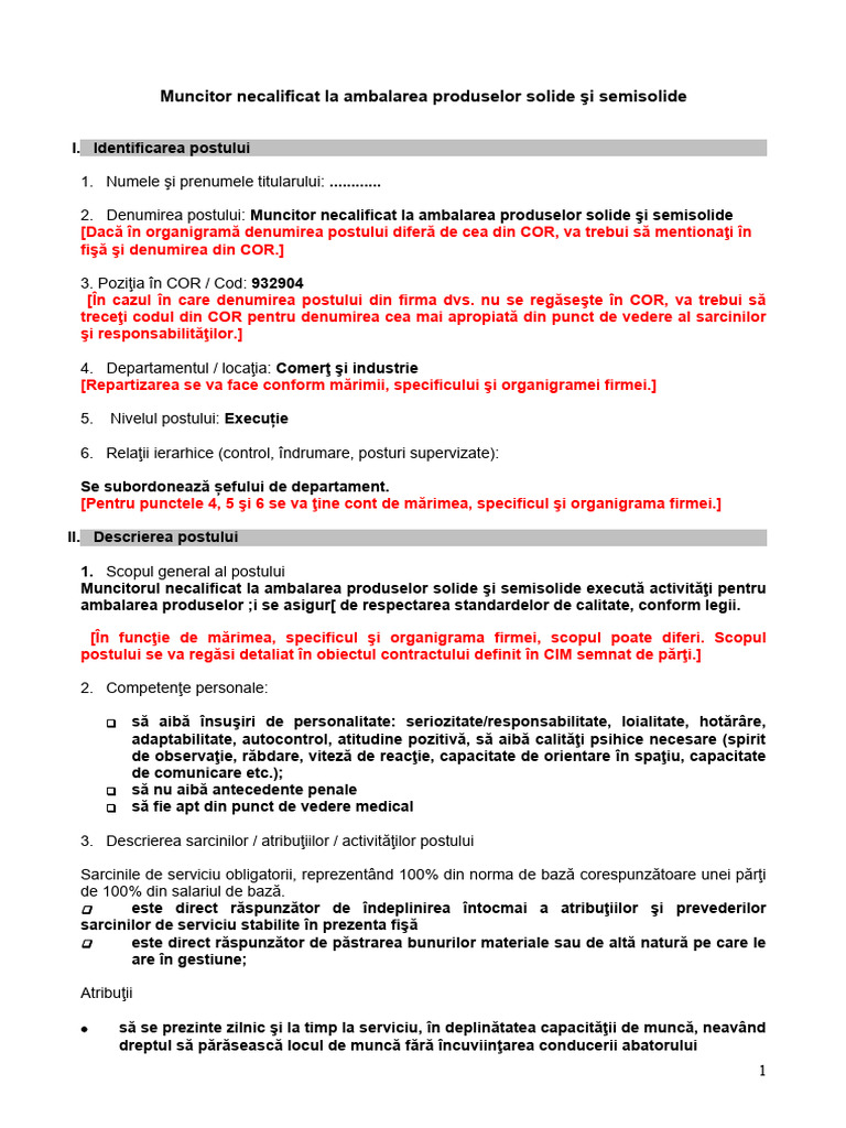 2. Denumirea postului: Muncitor necalificat la ambalarea produselor solide şi semisolide