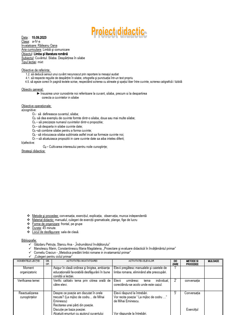 obiectivelor “Cuvantul. Silaba. Despartirea cuvintelor in