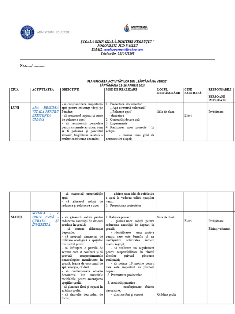 ZIUA ACTIVITATEA OBIECTIVE MOD DE REALIZARE LOCUL CINE RESPONSABILI