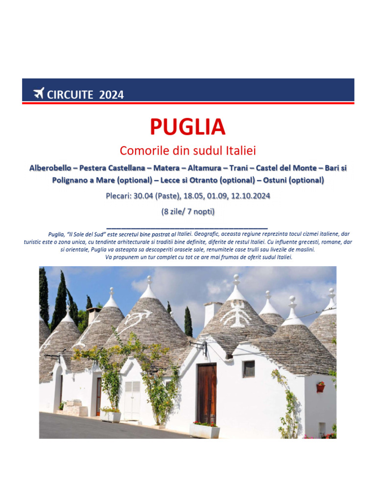la hotel Vilaggio Meditur 4* sau similar pentru grupurile din 30.04, 18.05 si 12.10 si la hotel Masseria Casselli 4* sau similar