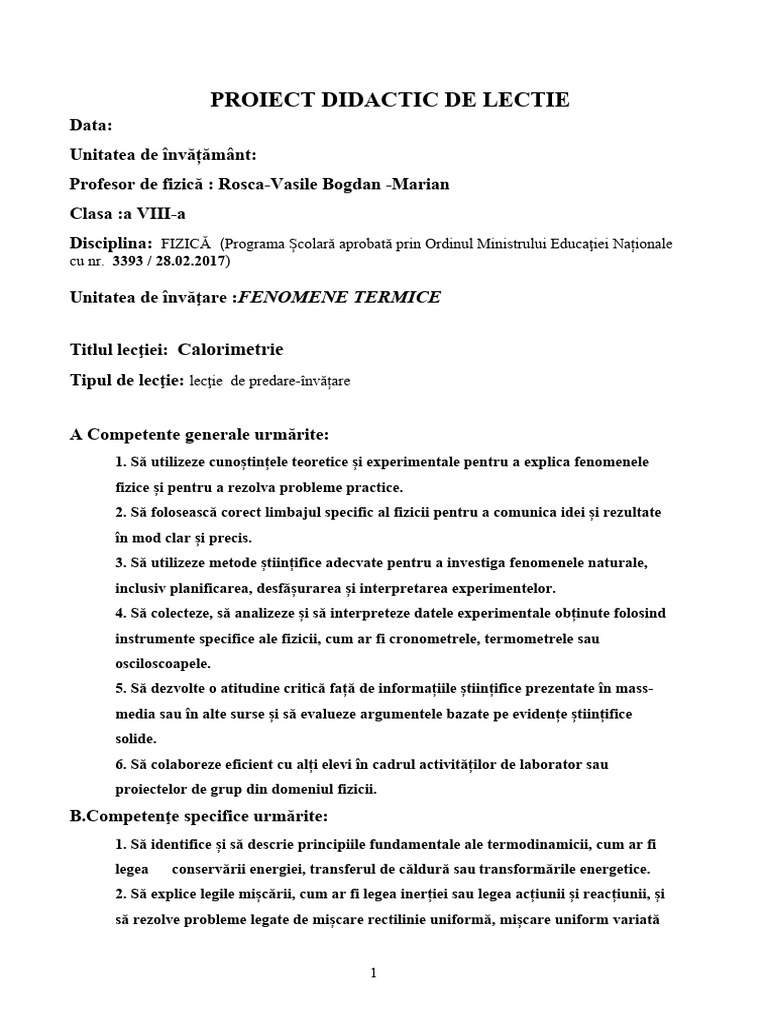 Disciplina: FIZICĂ (Programa Școlară aprobată prin Ordinul Ministrului Educaţiei Naționale