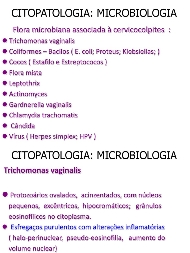 Organismos procariotas intermdirios entre vrus e bactrias Parasitas intra-celulares obrigatrios Esfregaos purulentos com macrfagos e cls escamosas com hipercromasia nuclear e cariomegalia Alteraes citopticas caracterizadas por incluses citoplasmticas com bordas bem definidas e alvo central; parasita clulas metaplsicas.