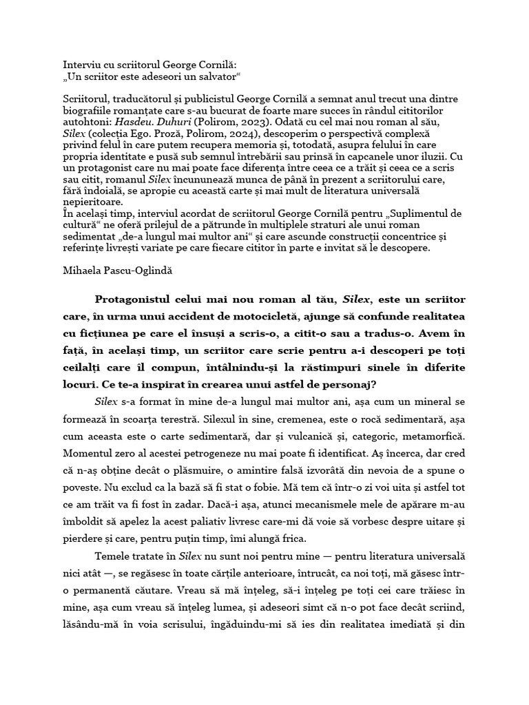 În același timp, interviul acordat de scriitorul George Cornilă pentru „Suplimentul de