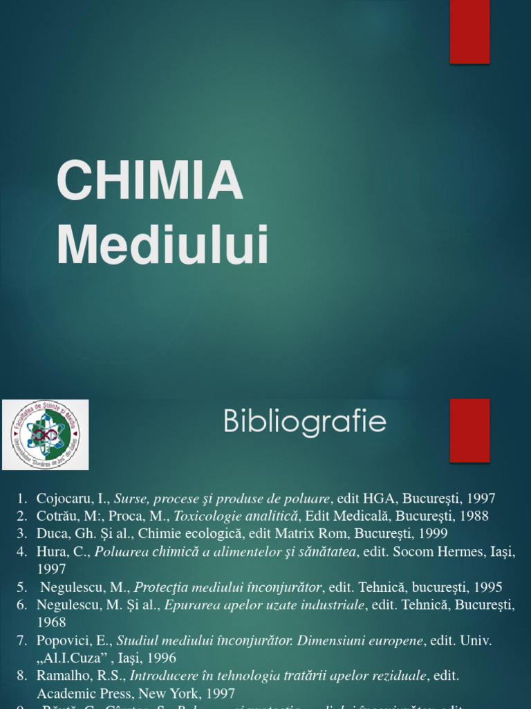 1. Cojocaru, I., Surse, procese şi produse de poluare, edit HGA, Bucureşti, 1997