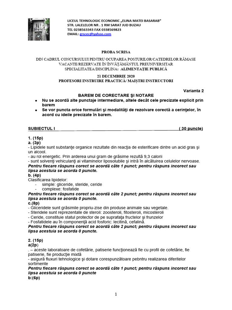 SPECIALITATEA/DISCIPLINA: ALIMENTAŢIE PUBLICĂ