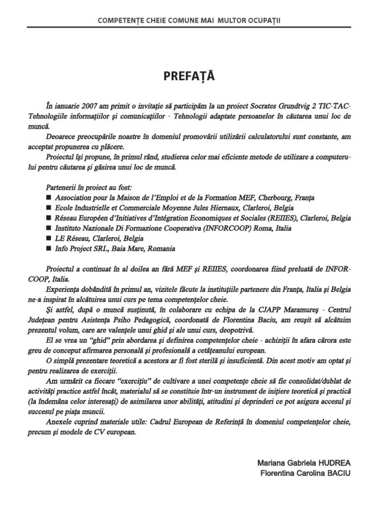 n ianuarie 2007 am primit o invitaie s participm la un proiect Socrates Grundtvig 2 TIC-TACu u T Tehnologiile informaiilor i comunicaiilor - Tehnologii adaptate persoanelor n cutarea unui loc de u u u munc. u Deoarece preocuprile noastre n domeniul promovrii utilizrii calculatorului sunt constante, am u u u uu u acceptat propunerea cu plcere. u u Proiectul i propune, n primul rnd, studierea celor mai eficiente metode de utilizare a computeruu u u u u u lui pentru cutarea i gsirea unui loc de munc. u u u u u Partenerii n proiect au fost: u Association pour la Maison de lEmploi et de la Formation MEF, Cherbourg, Frana u u Ecole Industrielle et Commerciale Moyenne Jules Hiernaux, Clarleroi, Belgia u u u Rseau Europen dInitiatives dIntgration Economiques et Sociales (REIIES), Clarleroi, Belgia u u u ) Instituto Nazionale Di Formazione Cooperativa (INFORCOOP) Roma, Italia u ) LE Rseau, Clarleroi, Belgia u Info Project SRL, Baia Mare, Romania u Proiectul a continuat n al doilea an fr MEF i REIIES, coordonarea fiind preluat de INFORu u COOP, Italia. Experiena dobndit n primul an, vizitele fcute la instituiile partenere din Frana, Italia i Belgia u u u ne-a inspirat n alctuirea unui curs pe tema competenelor cheie. a u u u i astfel, dup o munc susinut, n colaborare cu echipa de la CJAPP Maramure - Centrul u u u u u u u Judeean pentru Asistena Psiho Pedagogic, coordonat de Florentina Baciu, am reuit s alctuim u u u u u prezentul volum, care are valenele unui ghid i ale unui curs, deopotriv. u u u u u El se vrea un ghid prin abordarea i definirea competenelor cheie - achiziii n afara crora este greu de conceput afirmarea personal i profesional a ceteanului european. u u uu u u O simpl prezentare teoretic a acestora ar fi fost steril i insuficient. Din acest motiv am optat i pentru realizarea de exerciii. u Am urmrit ca fiecare exerciiu de cultivare a unei competene cheie s fie consolidat/dublat de u u u activiti practice astfel nct, materialul s se constituie ntr-un instrument de iniiere teoretic i practic u u u u (la ndemna celor interesai) de asimilarea unor abiliti, atitudini i deprinderi ce pot asigura accesul i ) u u u succesul pe piaa muncii. u u u Anexele cuprind materiale utile: Cadrul European de Referin n domeniul competenelor cheie, u u u u precum i modele de CV european. u u