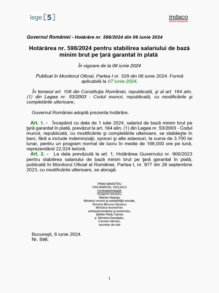 Art. 1. - Începând cu data de 1 iulie 2024, salariul de bază minim brut pe